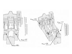Figure 4 - Église de São Francisco, à Horta: tensions principales de compression (kPa) pour les efforts verticaux (façade Nord et perspective). |